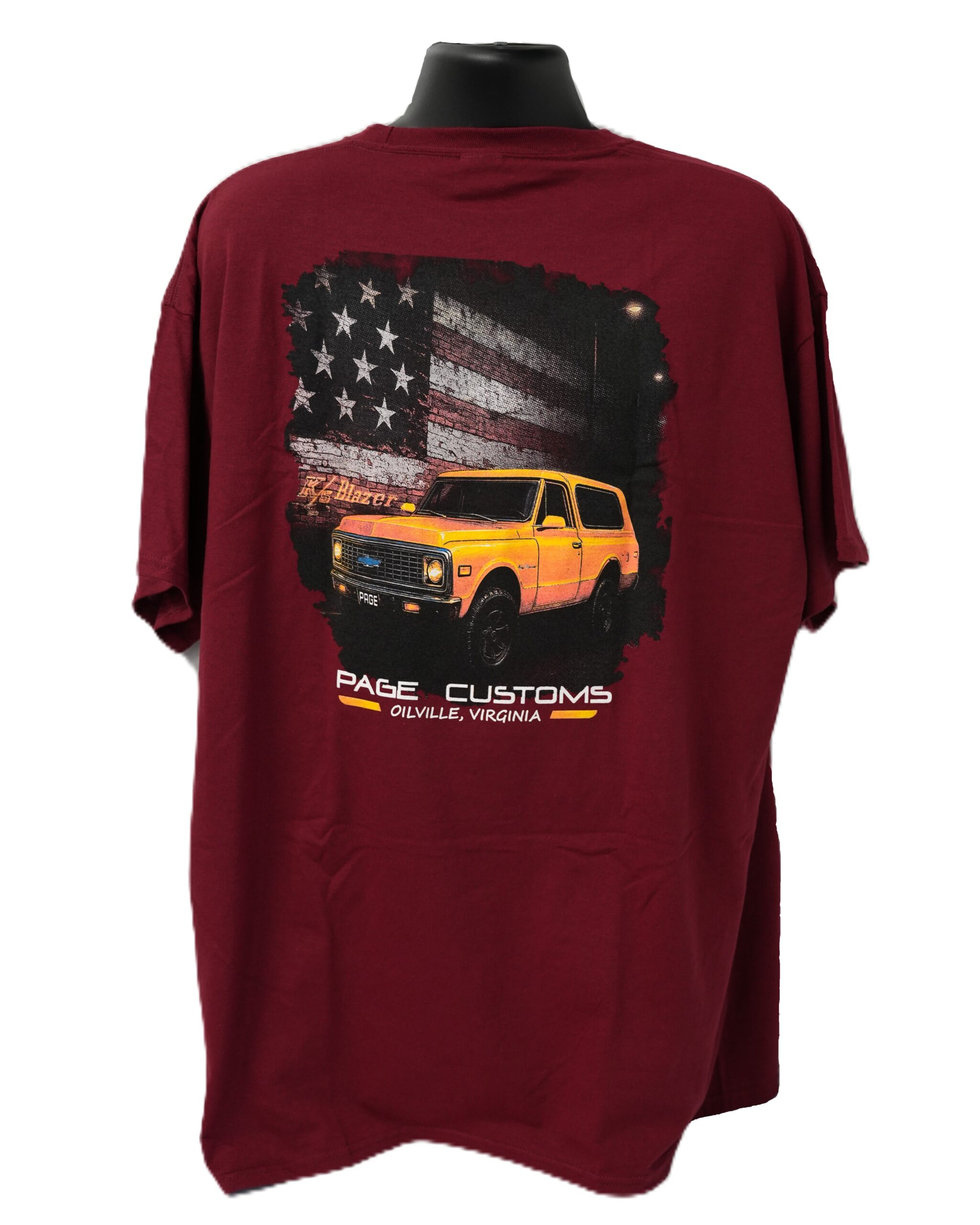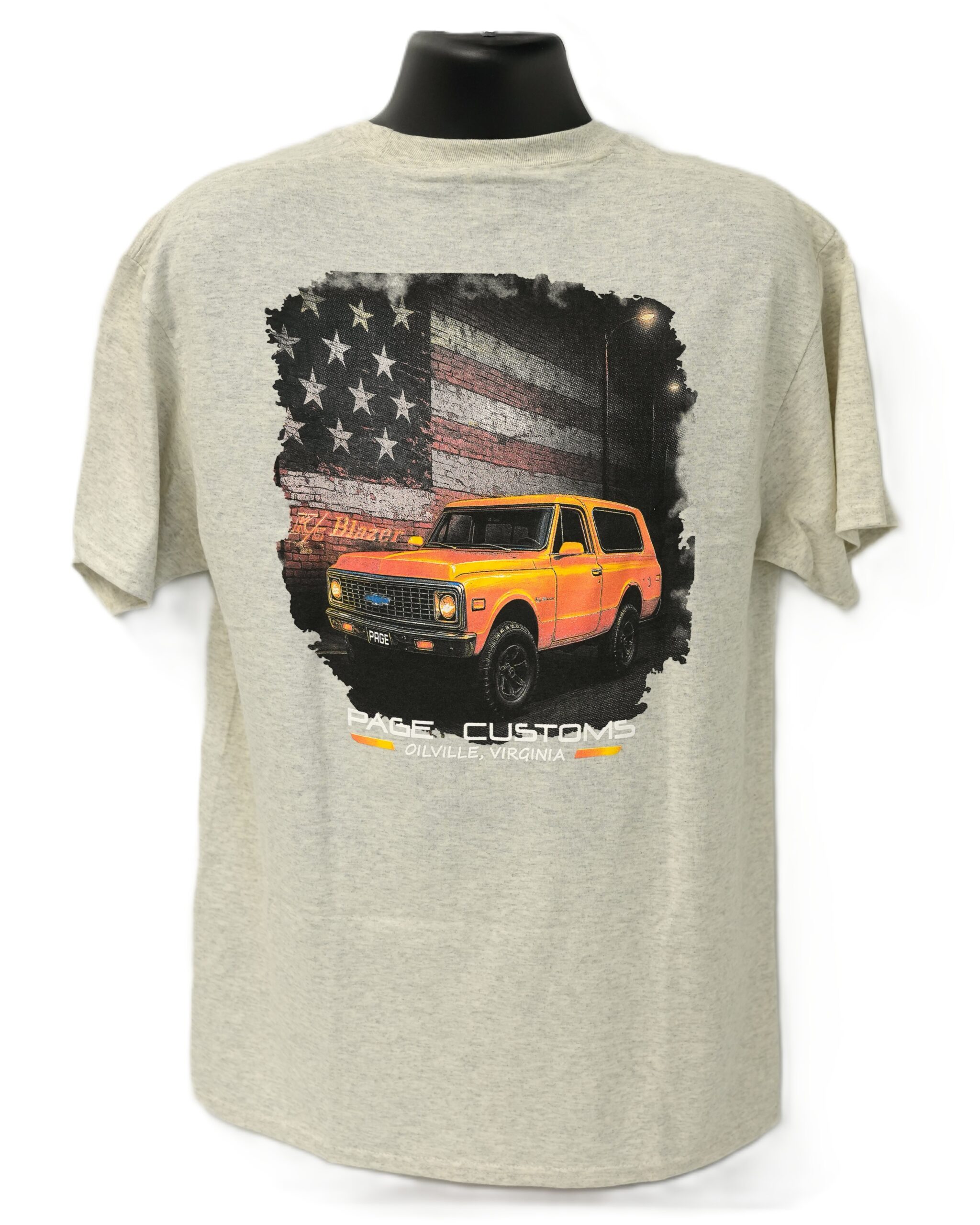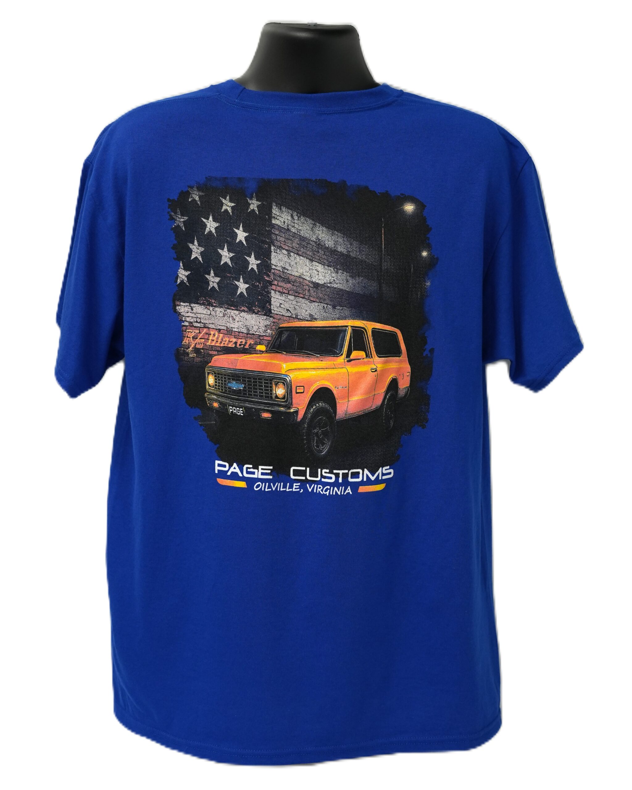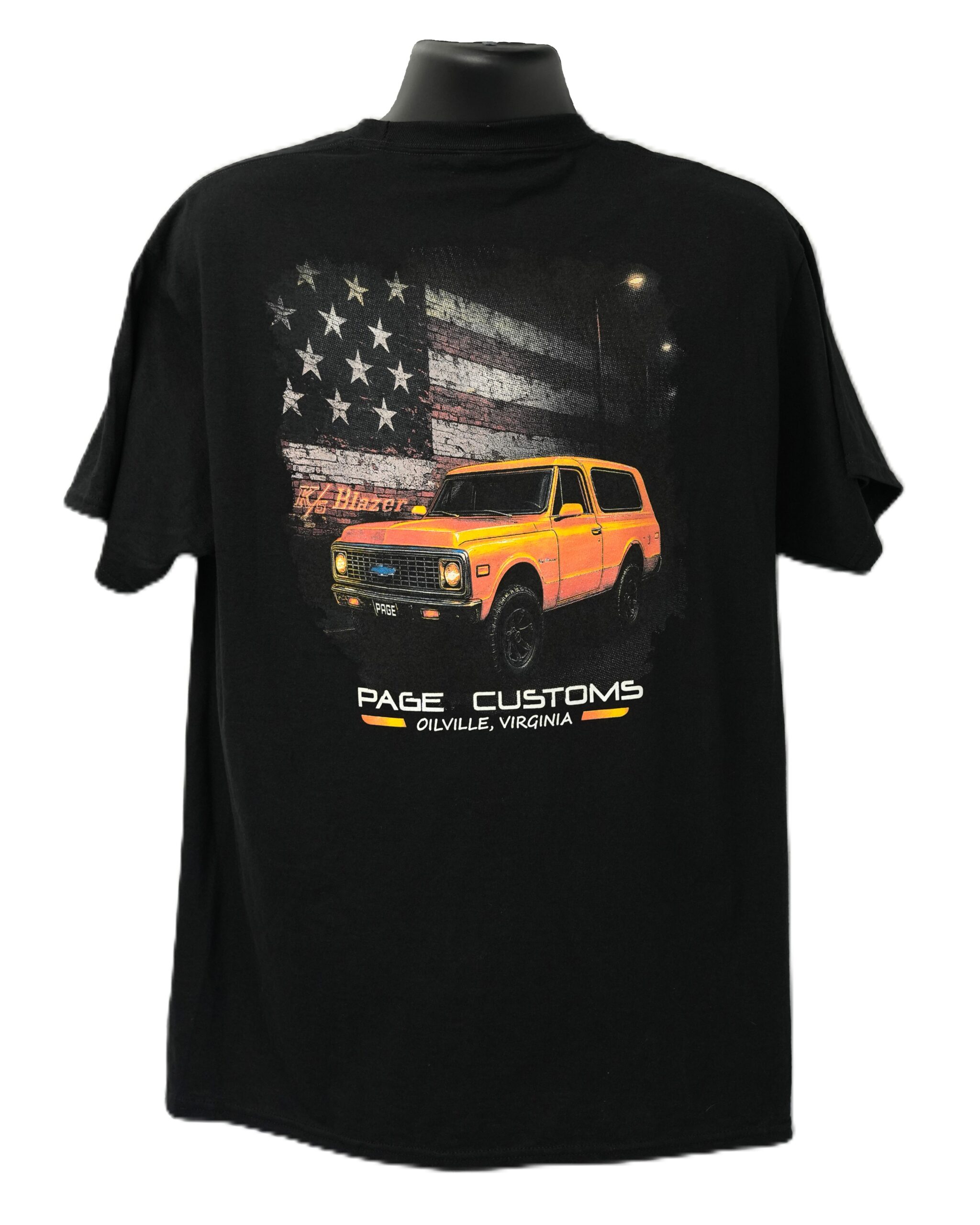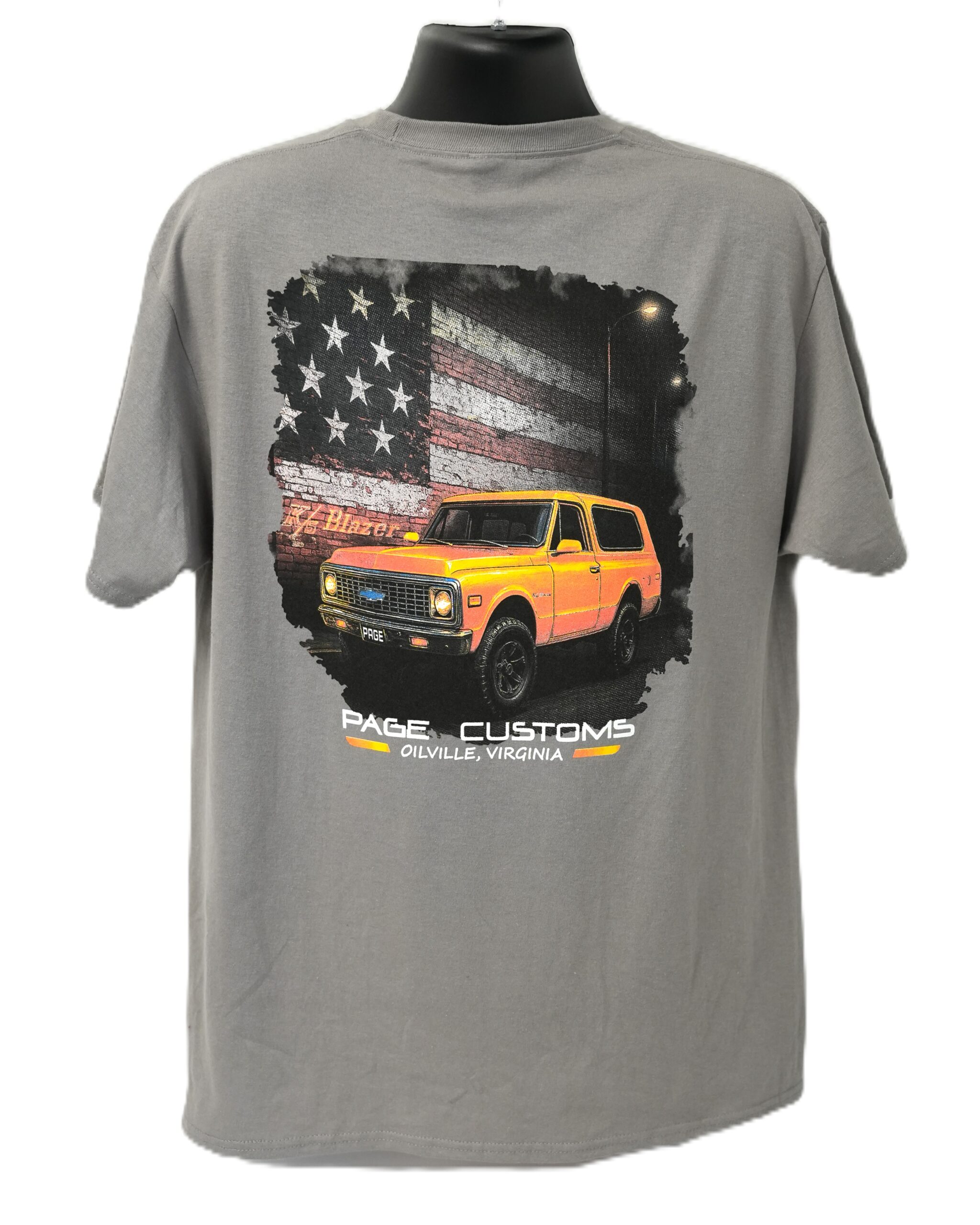 This shirt features the Page Customs truck logo on the front along with a K5 Blazer Graphic on the back.