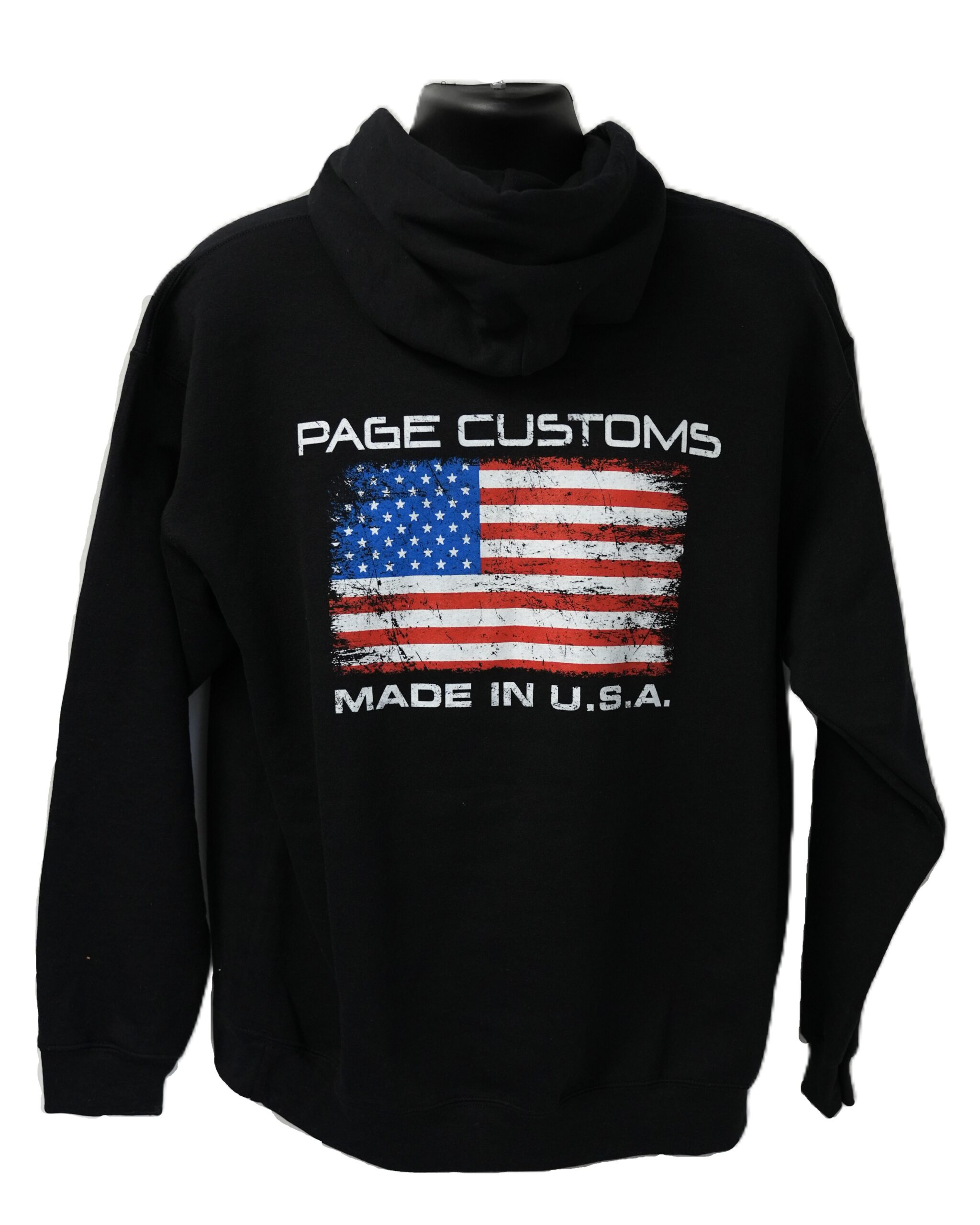 This hoodie from Gildan features the small Page Customs flag logo on the front along with the large USA flag Page Customs design on the back. *Sizes are limited due to low stock*