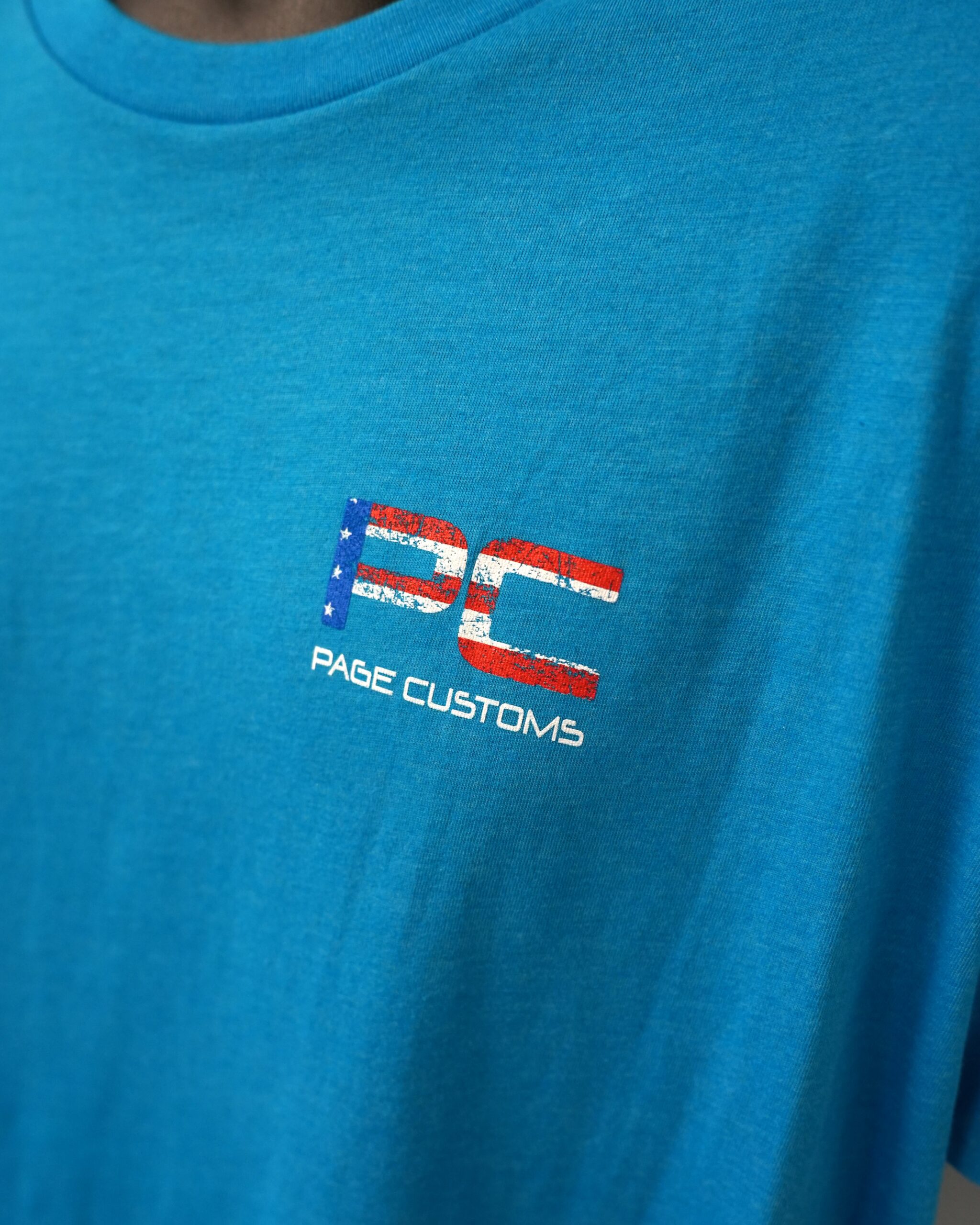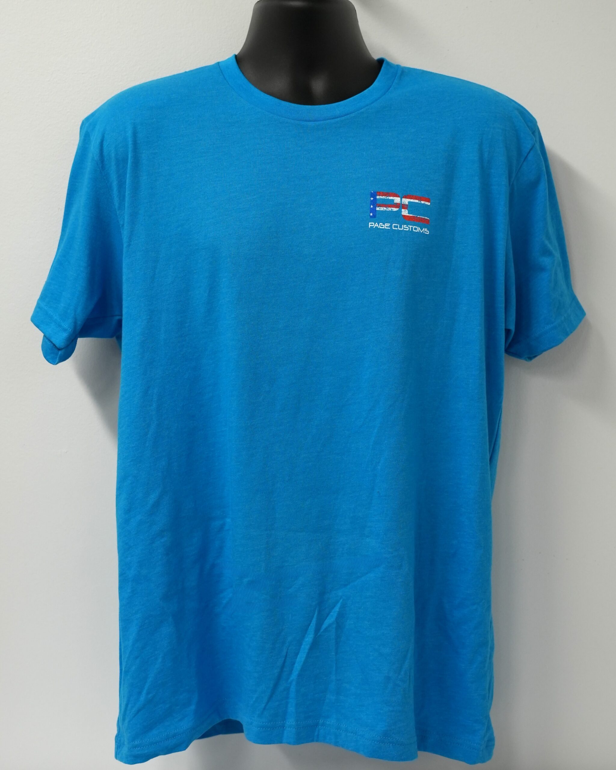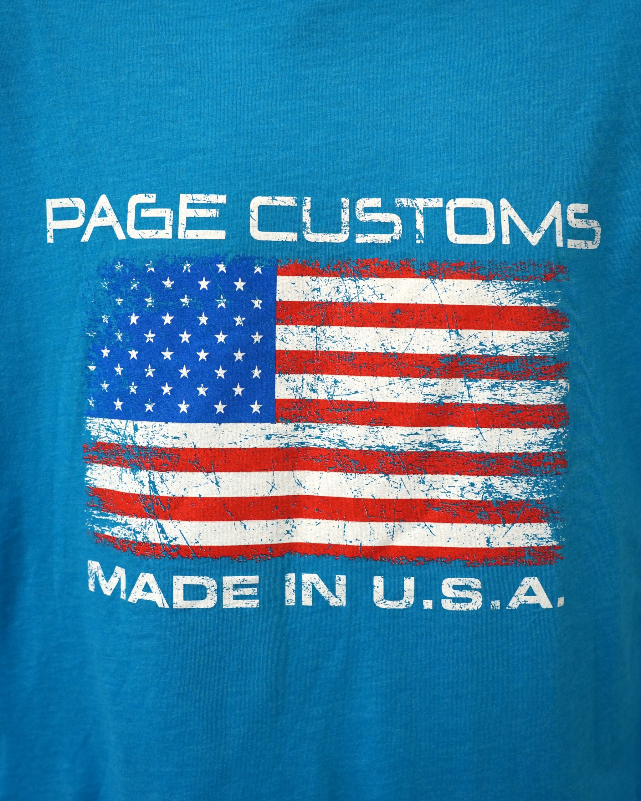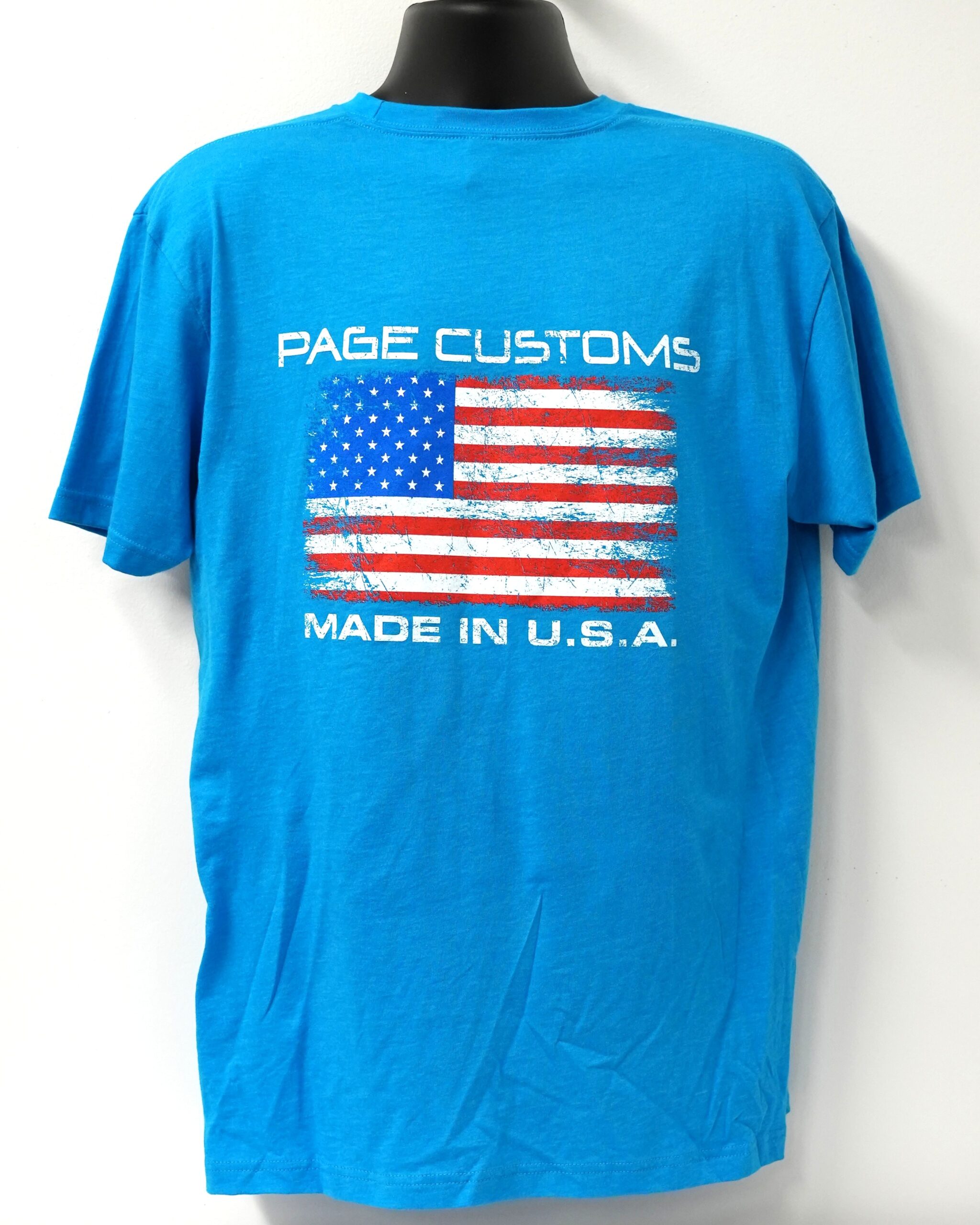 This shirt from Next Level Apparel features the small Page Customs flag logo on the front along with the large American Flag on the back and reads “Made in U.S.A.”